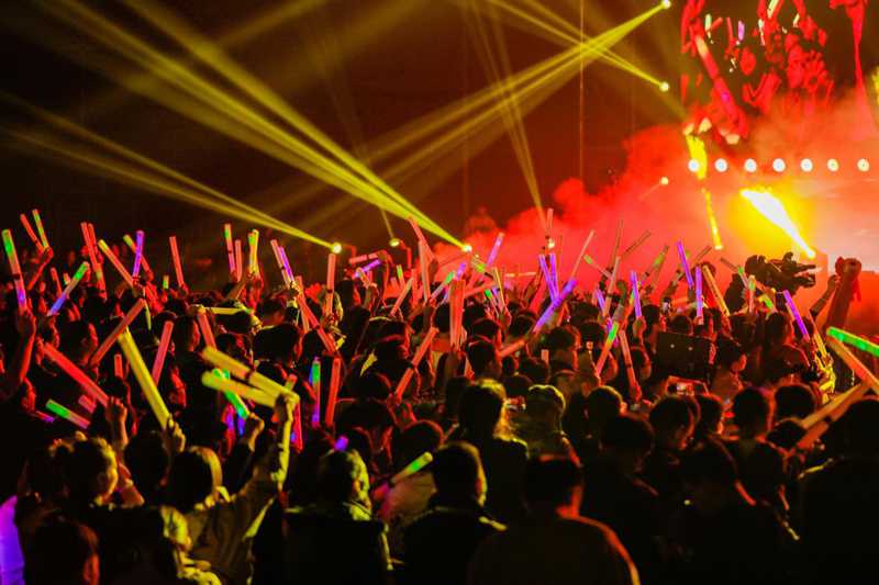活动现场,精彩节目不断,俊男靓女,即刻开“嗨”。新流派Ipad留声机乐队及聚丙乐队先后十余首歌曲上演电音轰趴,台上电音流动,台下荧光闪烁,全场观众跟着节拍动感舞动,让重庆微凉的夜空瞬间热情高涨。而吉克隽逸三首成名曲联唱,更是将现场不断推向高潮,打造了一场真正的嗨玩儿盛宴。