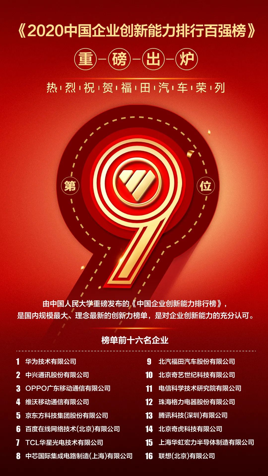 福田汽车荣列《2020中国企业创新能力排行百强榜》第九位! 编辑张靖 企业快讯2021年1月6日 09:2310.36W0 2020中国企业创新能力排行百强榜出炉, 热烈祝贺福田汽车荣列第9 X新世代—创新无极限 福田戴姆勒汽车(110)福田欧曼(144)福田汽车(354)本文来源福田汽车,经授权后由编辑张靖发布,观点不代表提加商用车网的立场,转载请联系原作者。编辑张靖提加商用车小编,还请大家多指教!6.22K941.45M39.63W