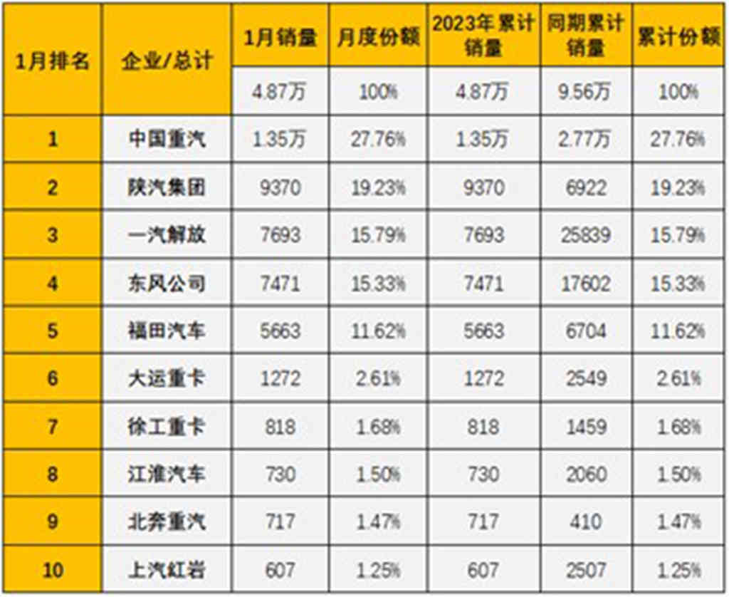 岁序常易,华章日新。根据中汽协数据,中国重汽以1.35万辆的成绩荣登2023年1月份销量榜首,市占率达27.76%,并成为1月唯一销量破万的企业,以“开战即决战”的状态,勇夺首月“开门红”。中国重汽的斐然成绩当然不是仅靠一句“不争第一就是在混”的口号喊来的,而是一步一个脚印拼出来的,1月份中国重汽在产品和营销上大动作频出,为社会提供了更多物流装备解决方案。