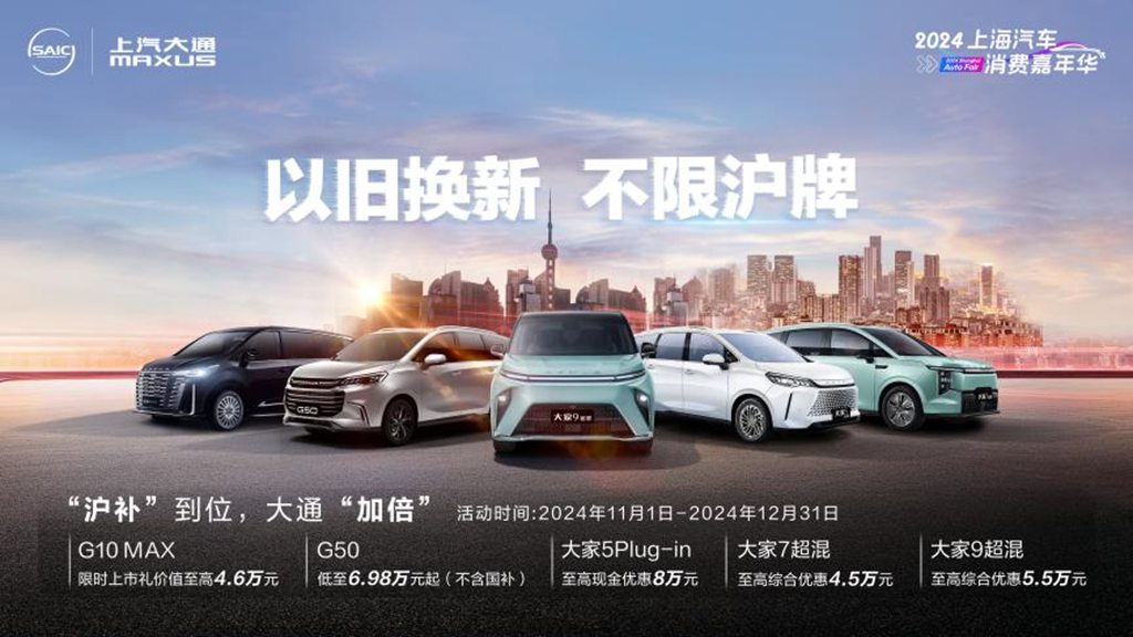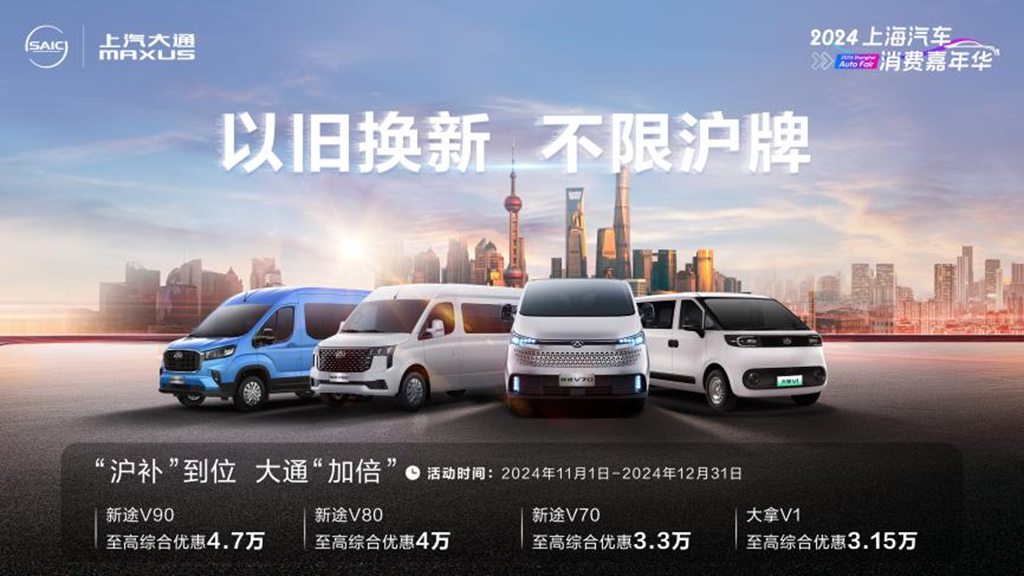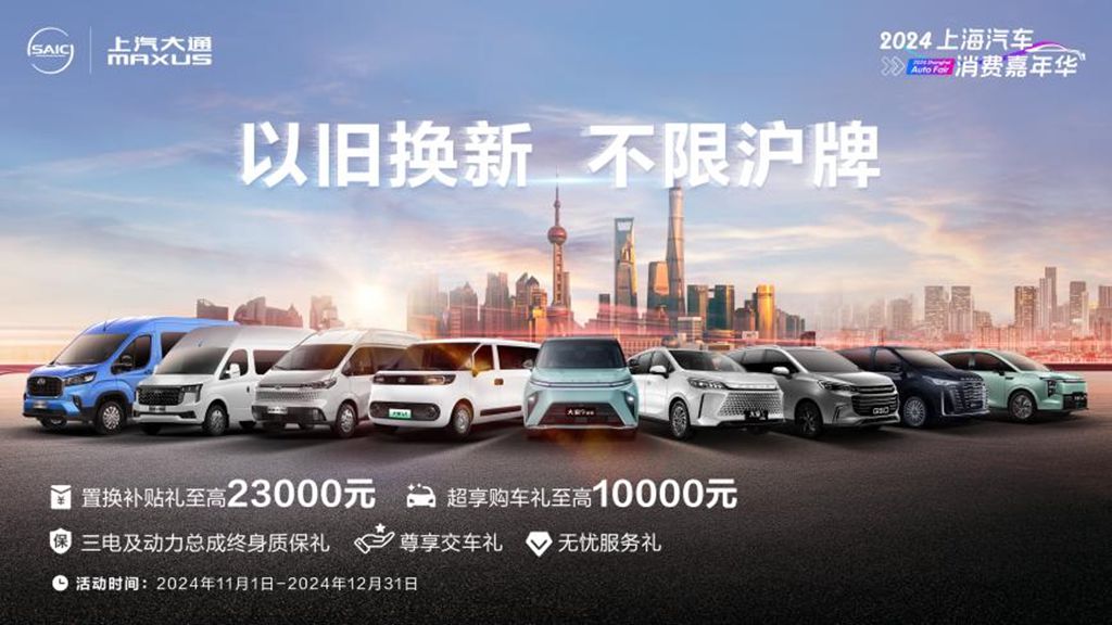 沪上金秋,焕新驰骋!在国家大力推动设备更新与消费品以旧换新行动中,上海市勇立潮头领航前行,积极推出惠民惠企的汽车以旧换新方案,带动申城汽车消费向新而行。11月1日,升级进阶的福利也高燃释放,不仅大额补贴延续,还取消“沪牌”限制,向更大范围的长三角地区汽车以旧换新消费者“敞开怀抱”,上汽集团同步启动“2024上海汽车消费嘉年华”活动,优惠福利“满满干货”。“沪补”到位,大通“加倍”!作为上海本地知名汽车品牌的上汽大通MAXUS,更在这场“焕新盛宴”上诚意拉满,多品系超值福利同步推出:即日起至12月31日,除了政府补贴之外,上汽大通MAXUS还额外带来至高23000元置换补贴、至高10000元购车礼、免首付、低利率、全险补贴、现金优惠、三电及动力总成终身质保等多重好礼!上汽大通MAXUS以实际行动助力汽车以旧换新政策加速落地,更以“真金白银”让更多用户享受到“加倍”的沪补优惠。诚挚欢迎在沪及非沪车主前来体验大通购车狂欢!