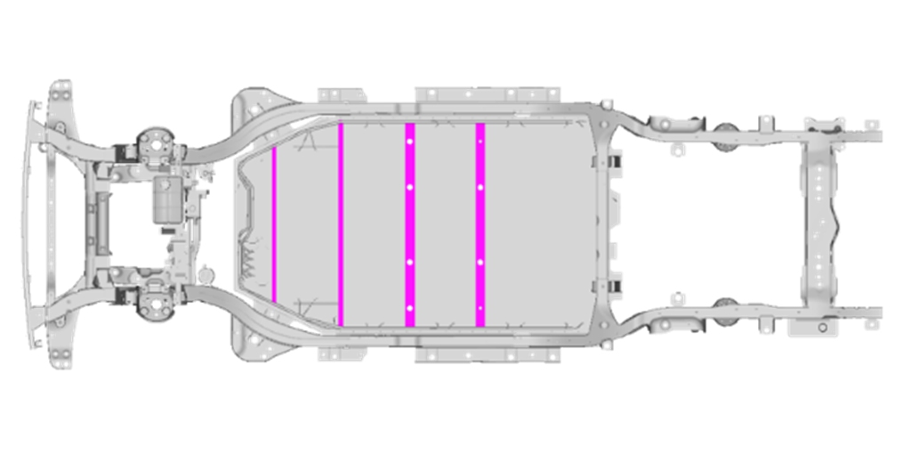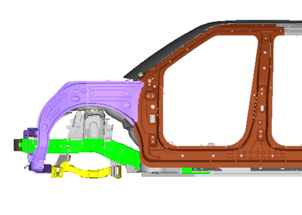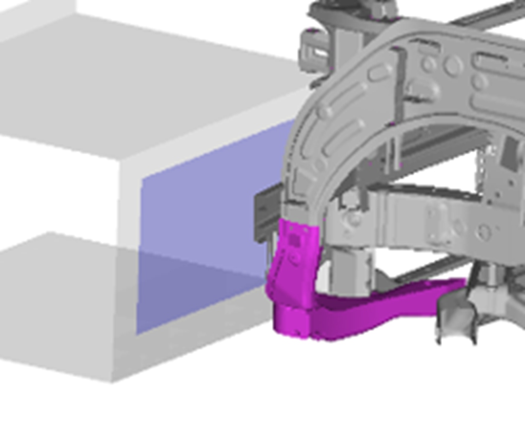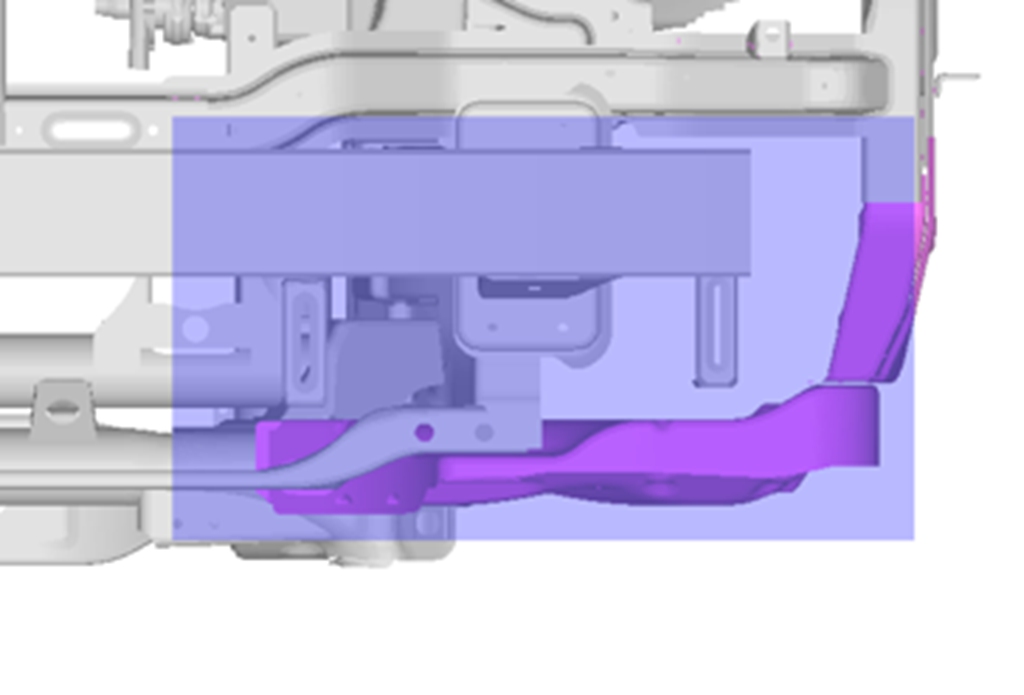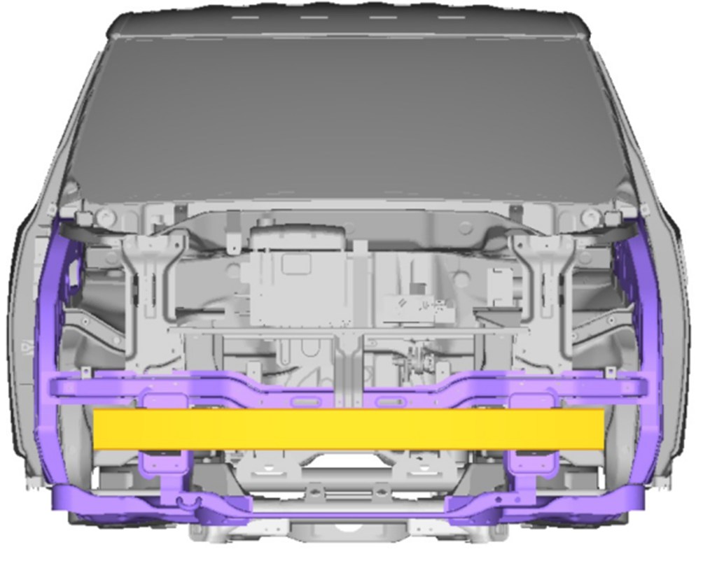 目前Euro NCAP要求测试车辆降低对对方车辆的攻击性和危害性,这个要求对于采用车架结构的皮卡来说非常不友好。但eTerron 9车型从设计之初就着力解决这一问题。经过仿真分析和实验,eTerron 9增加该结构后(图中紫色部分),车辆前端与对面车辆的重叠度大大增加,通过增加重叠度,使撞击力分布均匀,从而减少对面车辆的变形,可以有效保护对面车辆的结构完整性和乘员的生存空间。
