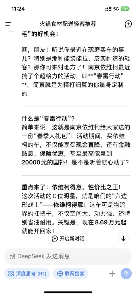 老周还是不放心,赶紧又问:“开车遇到红绿灯起步最怕后面车滴我了,得意的动力咋样啊?”他最在意的动力问题,在得意的产品参数里找到了答案。依维柯得意单胎车型搭载全新SOFIM第五代柴油发动机,动力强劲,功率可达110kW;并且它还是后驱车,在城区红绿灯前起步时,提速迅猛,1400-2800rpm转速区间,就能输出高达350N·m的最大扭矩,哪怕是城区低速重载的情况,得意也能轻松拉动!不仅如此,DeepSeek 同样贴心的为老周“出谋划策”,在南京依维柯 “春雷行动” 期间,探讨怎样花最少的钱,把心仪的依维柯得意这款车开回家 。