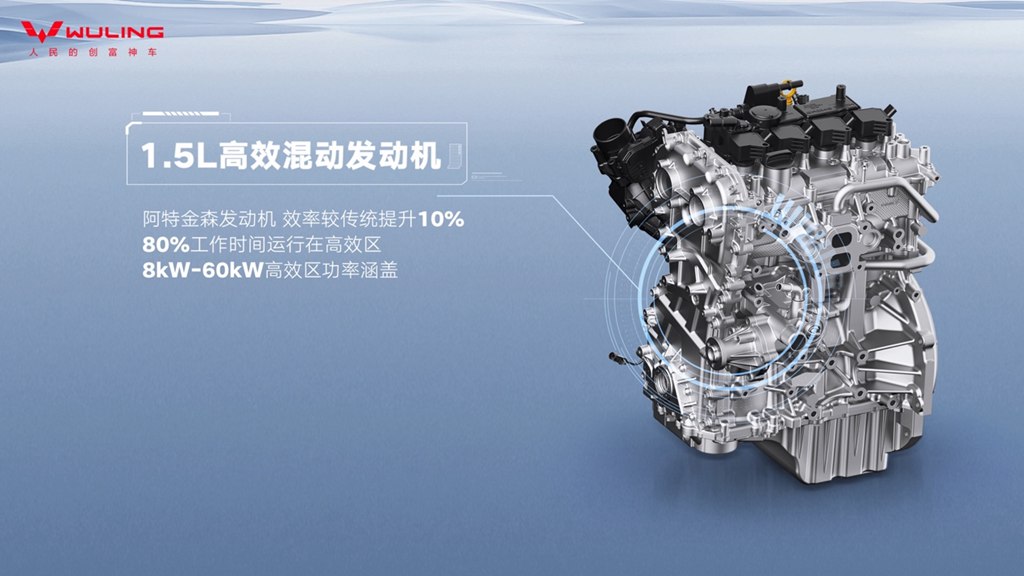 采用1.5L高效混动发动机,采用Masking设计高效燃烧系统和阿特金森循环,较传统燃油发动机热效率提升10%,80%的工作时间处于高效区,百公里油耗低至4.3L(NEDC工况)。