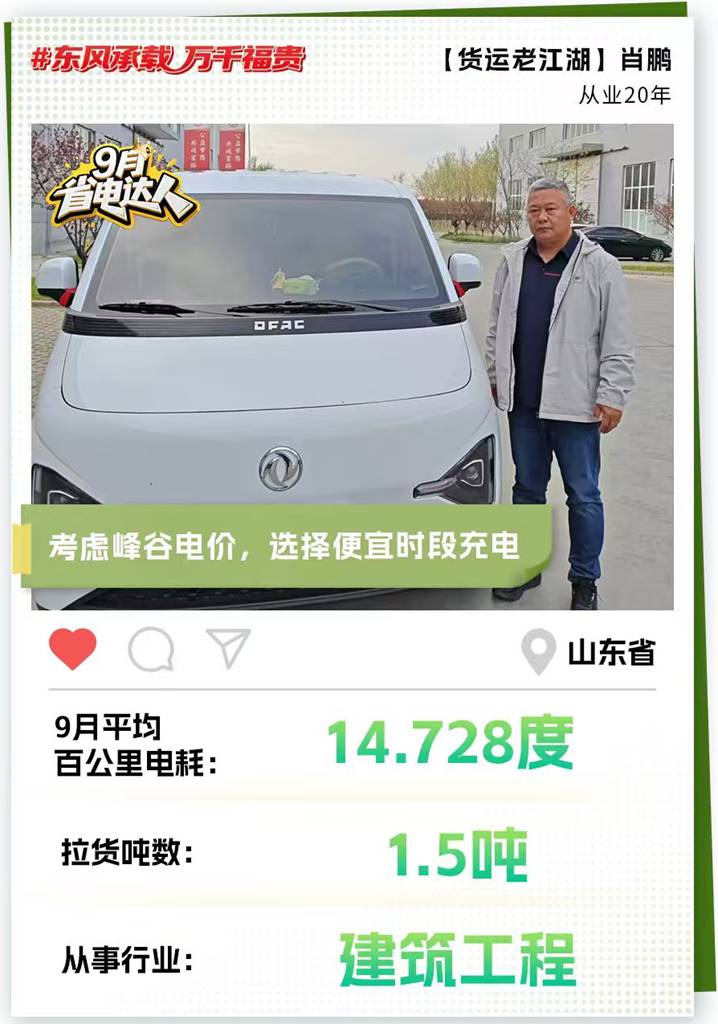 随着“福贵”精神传播愈广,东风股份“承载万千信赖,服务美好生活”的庄严承诺,也被越来越多的人所了解、信赖。越来越多的人加入东风睿立达“车主”大家庭,他们勤劳努力、积极向上,还凭借自身智慧总结出诸多节能妙招。来自山东的肖鹏师傅,就非常乐于将自己的经验与大家分享。