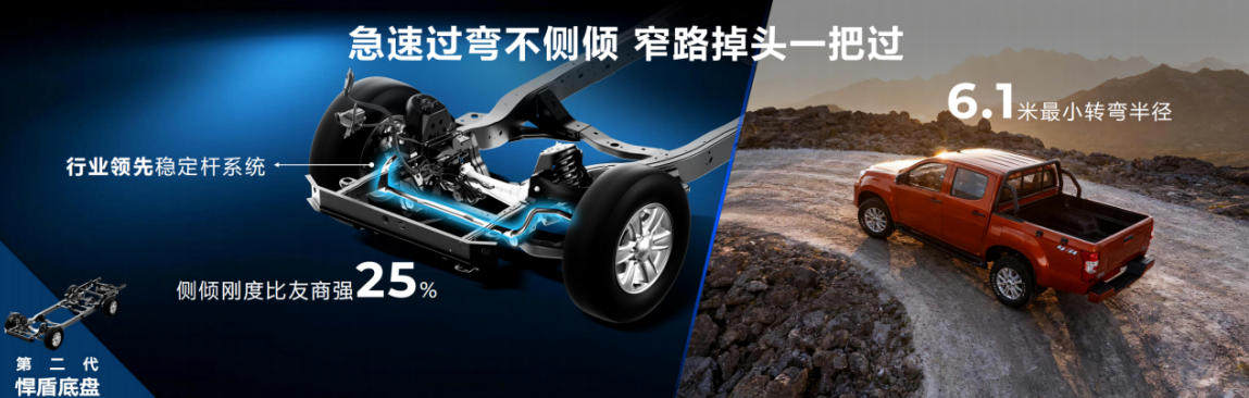 底盘方面,RE-MAX瑞迈搭载与D-MAX同源的第二代悍盾底盘,采用二纵九横车架结构(长轴)与业内独有的纵梁曲线式焊接工艺,轻松应对重载挑战。领先的稳定杆系统与6.1米最小转弯半径,让过弯更稳健从容。行业独有的分体式球头设计及6片板簧选项,无惧颠簸路况,这副硬核底盘成为用户前行路上最坚实的“定心骨”。