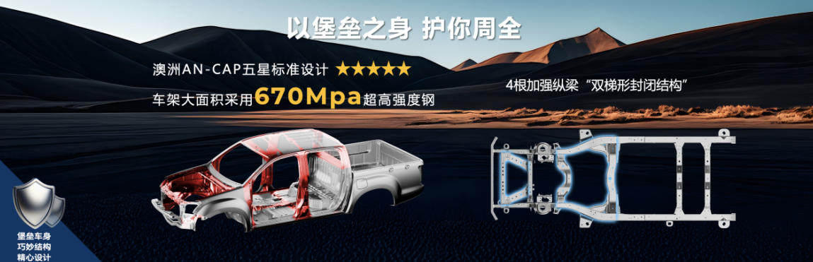 车身按照严苛的澳洲AN-CAP五星标准设计,大面积采用670Mpa超高强度钢,创新应用“双梯形封闭结构”堡垒式底盘,为乘员构筑坚实生存空间。系统性的底盘防护布局可主动规避刮碰风险,特别设计的车轮止侵块在碰撞时有效保护乘员与底盘部件。引擎盖行人保护溃缩结构等设计,则体现了对车外行人安全的周全考量。