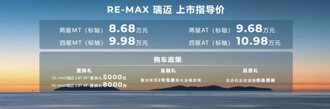 全新RE-MAX瑞迈上市指导价8.68万起,同步推出多重购车礼包:购买柴油2.8T手动挡车型可享5000元置换礼,自动挡车型可享8000元置换礼,并可叠加享受2年免息金融政策。