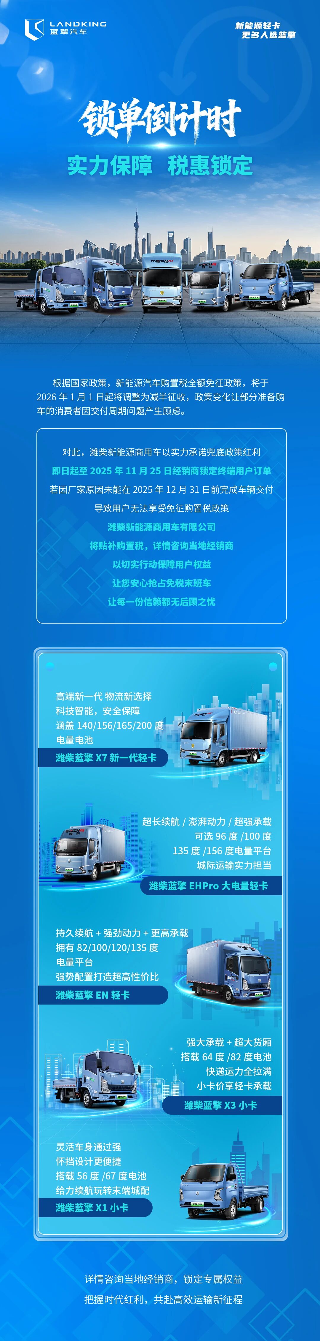 锁单倒计时!潍柴新能源商用车补贴购置税,为用户锁订专属权益! 陈念尊 企业快讯2025年11月21日 09:167000 潍柴新能源(7)潍柴蓝擎(15)本文来源企业提供,经授权后由陈念尊发布,观点不代表提加商用车网的立场,转载请联系原作者。陈念尊3411.22W4.26K