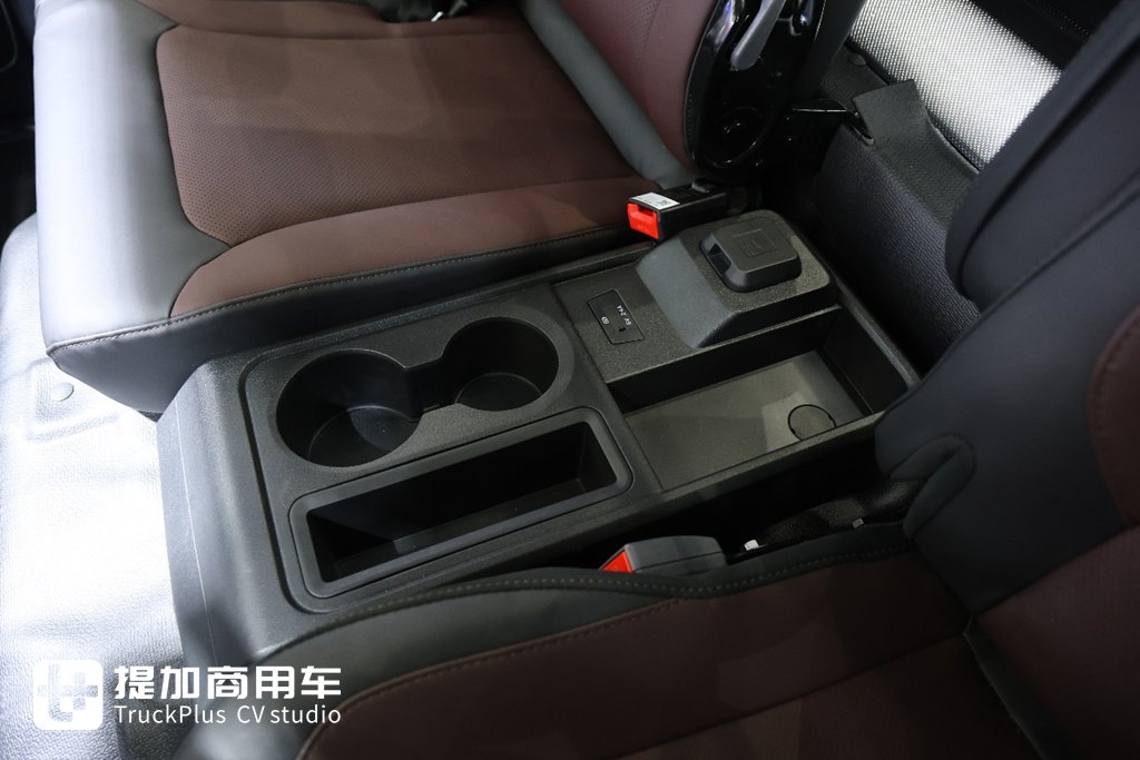 车内的储物空间表现还是很理想的,副驾驶前方有手套箱,工作台上可以抽拉出一个杯架,在主副驾中间也有用于放置杂物的开放式储物槽。