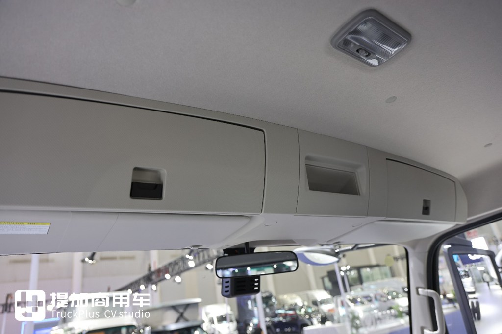 同时,这款车也是行业内少有带头顶柜的电动轻卡,车内的空间利用率得到进一步提升。阅读灯的位置不再设计在前方,也放到了中间,对车内整体照明的效果会更好。