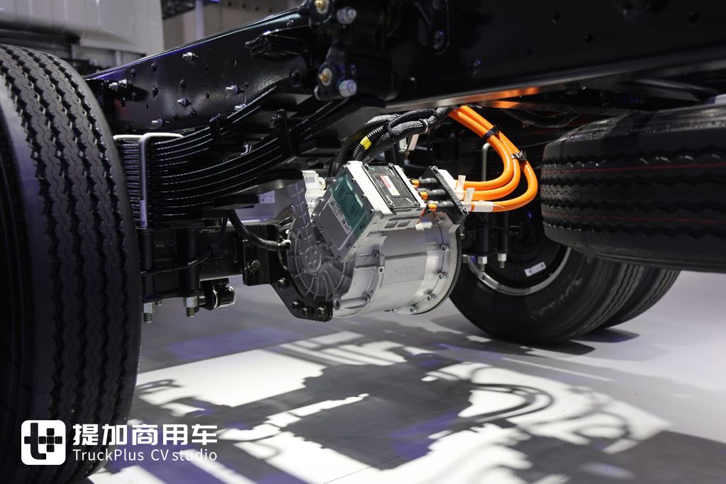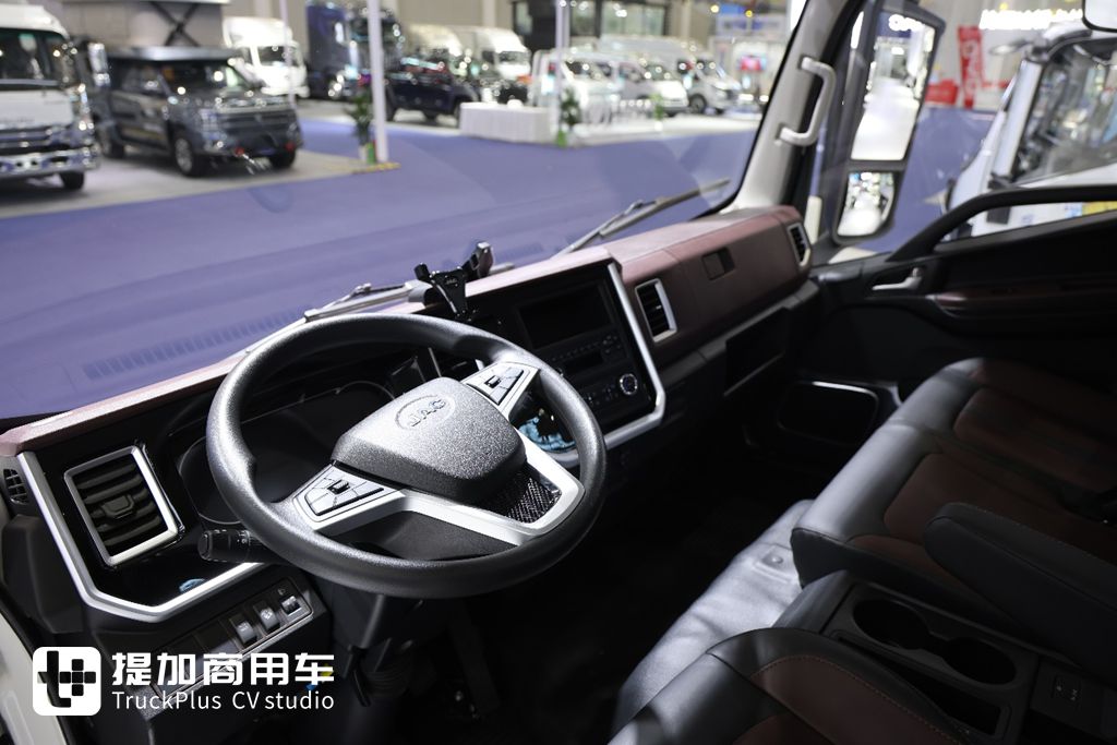 驾驶室后方进行了加宽设计,车顶上方带有原厂导流罩,以适配冷藏和大方量货箱的高度,在高速行驶的过程中有助于降低风阻,从而节省电耗。