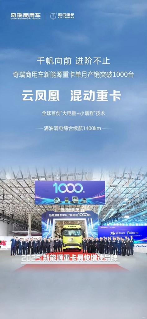 奇瑞商用车新能源重卡1-10月销量同比增长792%,领跑全行业! 陈念尊 企业快讯2025年11月27日 09:101.23K0 新联合,新征程,新未来”奇瑞商用车新能源重卡1-10月销量同比增长792%,领跑全行业,勇夺新能源重卡最快增速品牌! 集瑞联合(3)本文来源企业提供,经授权后由陈念尊发布,观点不代表提加商用车网的立场,转载请联系原作者。陈念尊10370.86W1.13W
