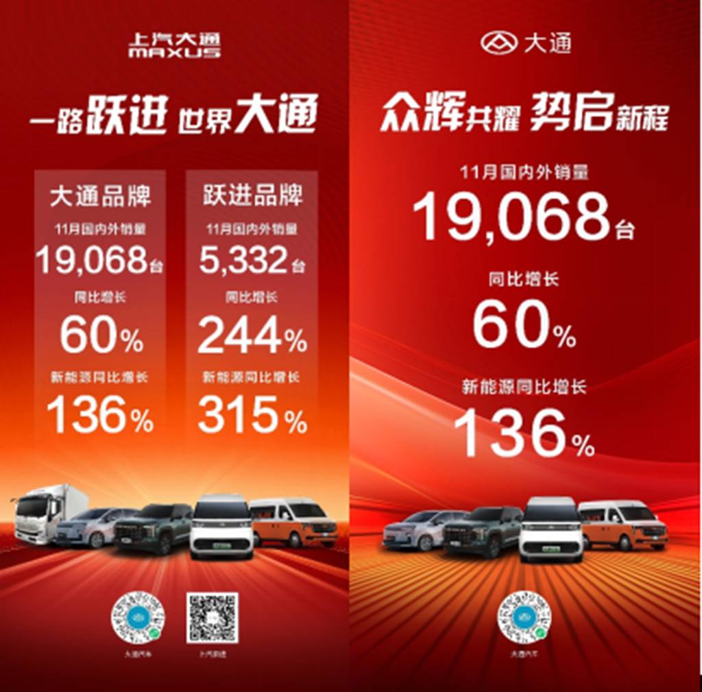 品牌焕新,启幕新程,上汽大通销量“十连增”,成客货运行业绿色首选。11月批售24,400辆,同比大增81%,并实现零售月销同比“十连增”。持续巩固在全球轻型商用车市场的领导地位,11月海外销量达10,095辆,同比大增92%,订单、批售、零售、发运量均实现“破万”,再创历史新高。新能源车型销量同比剧增196%,其中国内新能源车型销量占比达53%,转型步伐全面提速:新能源轻客“爆品”大通大拿热销3,207辆,同比劲增214%!跃进新能源车型销量同比增长315%、销量占比高达72%。实力引领,频获大单,大拿V1、大家9、大家7等多款新能源标杆产品成客货运行业信赖之选。