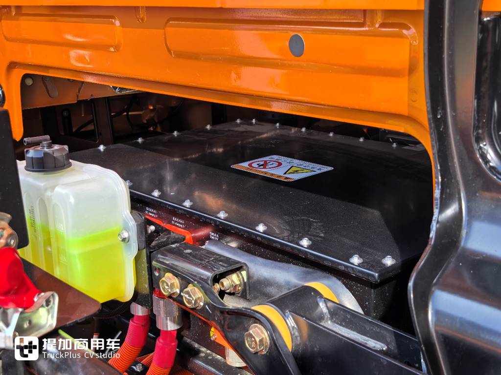 车辆电池为底置布局,电池包分布在底盘的两侧及中间位置,并没有像一些传统油改电车型一样应用后背电池的方案,单这一点便足以体现车辆的底盘架构是全新且专为新能源重卡开发的,属于CTC电池底盘一体化结构,在底盘零部件布局、前期装配工艺、后期维护保养等方面都有着领先的优势。