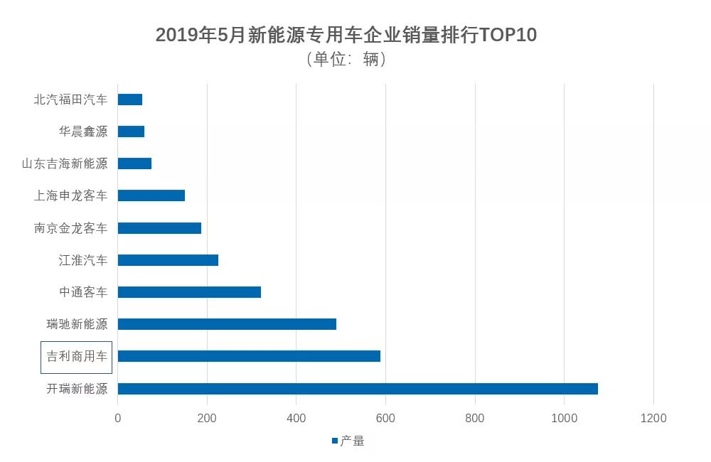 其中,吉利商用车5月生产新能源专用车2597辆,占5月新能源专用车生产总量的28.08%,夺得产量冠军。