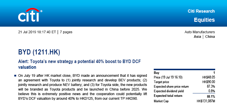 花旗、瑞信、中金等众多知名券商,针对比亚迪与丰田的合作,发布多篇“买入/增持”的研究报告。花旗在报告中指出,丰田的新策略,意味着将对比亚迪的折现现金流价值产生潜在40%的增幅。