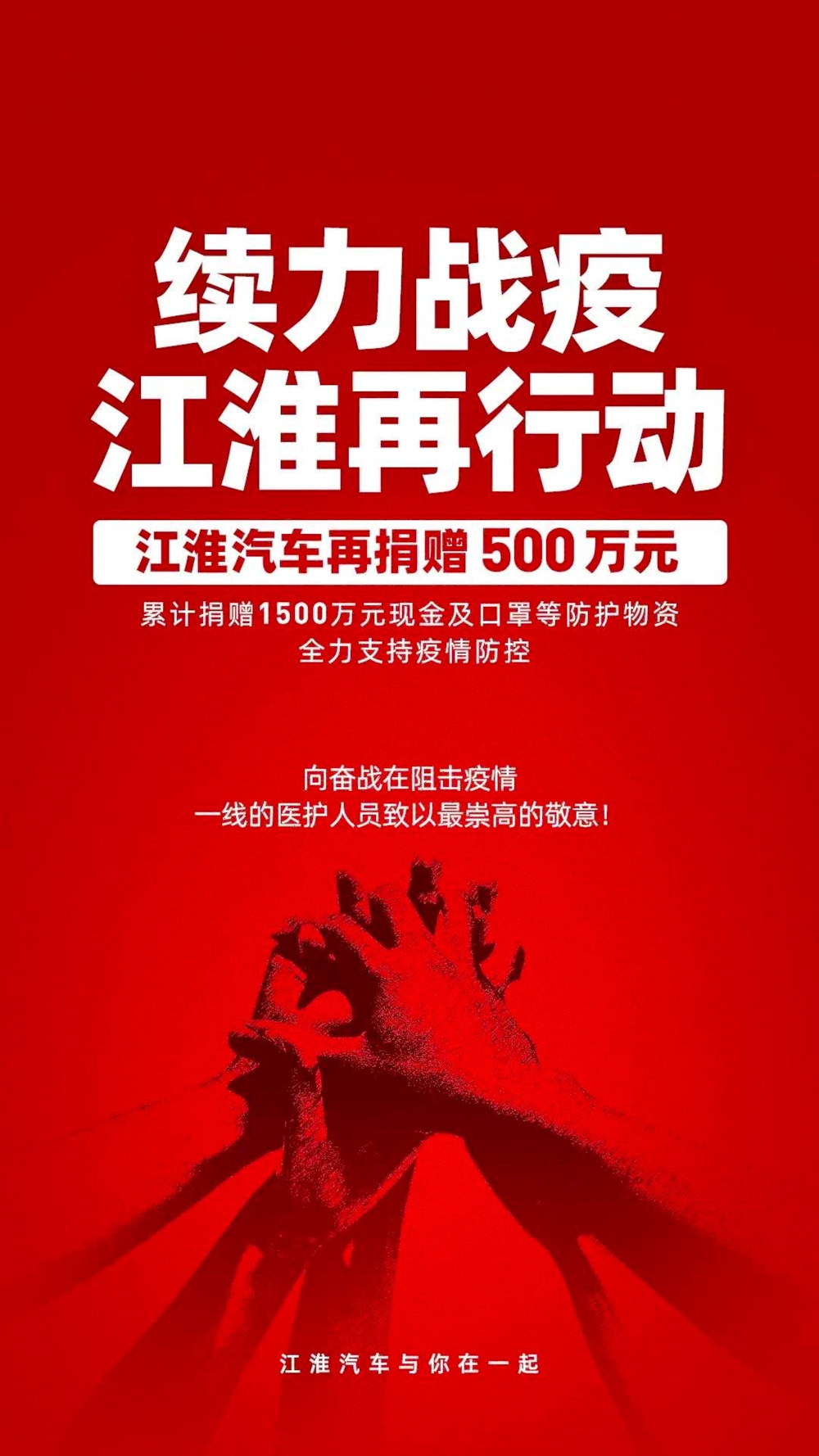 除了全力复工以外,江淮汽车还在疫情发生后快速响应,在1月29日捐赠1000万元现金,并于第二天派出由商务车、重卡组成的专业应急车队将300吨新鲜蔬菜的运抵武汉,更是在2月9日再捐500万元现金助力打赢疫情防控阻击战。守望相助,不负担当,江淮汽车也没有缺席,展现一家自主品牌车企该有的责任与担当。与此同时,江淮汽车在全国各地的分公司、子公司以及旗下所有品牌经销商4S店也按照当地政府要求,积极参加疫情防控工作,为阻击疫情提供保障。