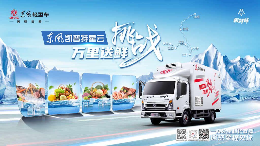 2022年7月6日, 东风凯普特星云·挑战万里送鲜活动即将开启。面向社会招募送鲜主角——流量网红、卡友(东风凯普特星云车主)各一名。两位主咖将从沈阳出发,途径济南、南京、宁波、广州、佛山、武汉,最终到达襄阳,记录万里送鲜行程,分享东风凯普特星云冷藏车用车经验、货运心得,打卡体验南北各地特色民俗!