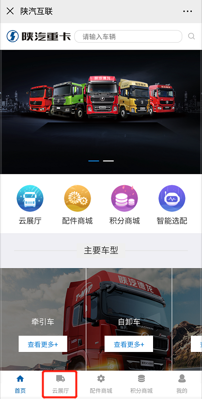 打开陕汽重卡官方微信点击【云展厅】,想什么时候看车,就什么时候看车