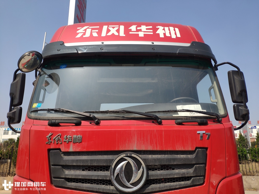 驾驶室顶部导流罩部分喷涂“东风华神”几个字样,用以强调东风属性,同时这也是要传播给用户的一个信息,我是东风车,我跟东风商用车关系很密切。