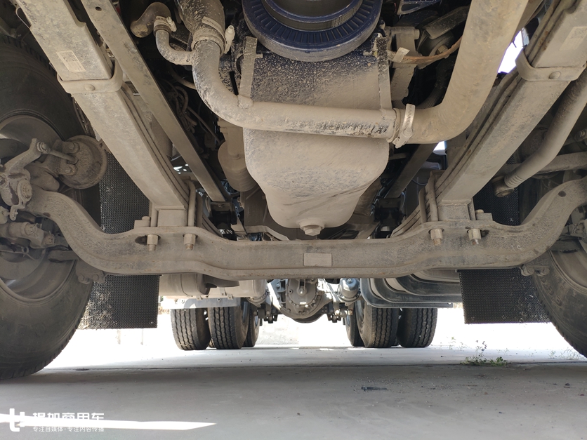 例如车架左侧,驾驶室底部可以清晰的看到发动机小水箱,布局和天龙一模一样。另外车架左侧还集成了一个容量大约800L的铝合金油箱,基本能保证充足的长续航能力。