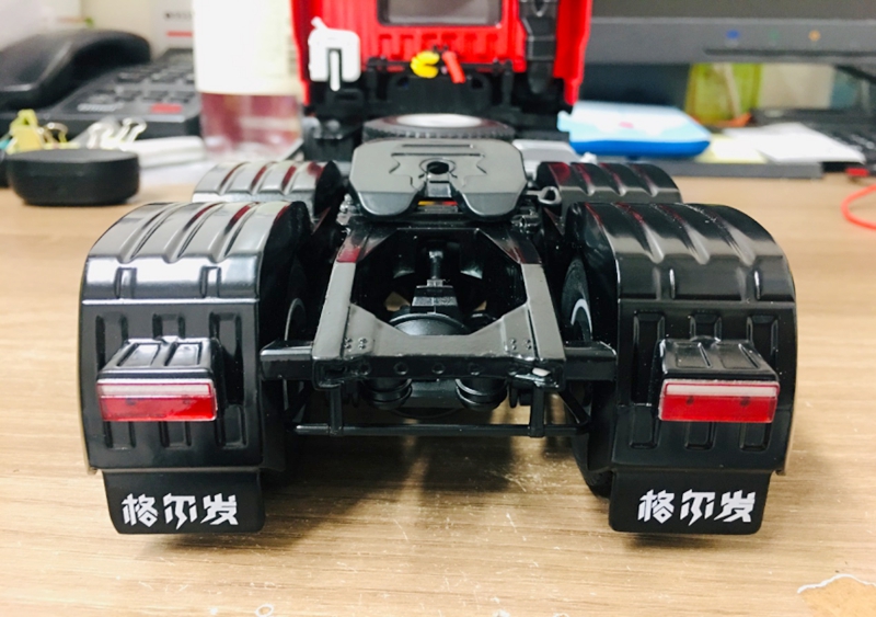驾驶室背后能很明显看得出格尔发对于这款来自韩国技术的驾驶室的改造,通过大面积外扩,增加驾驶室卧铺的宽度,以达到天朝交通运输行业对卡车卧铺的需求。后部的龙门架上也还原出了不少的结构,包括牵引车必不可少的半挂车连接电缆,还有冷却液罐、空滤等的结构。上方则使用贴纸,表现出红白反光条的装饰,不过模型上并没有反光功能。