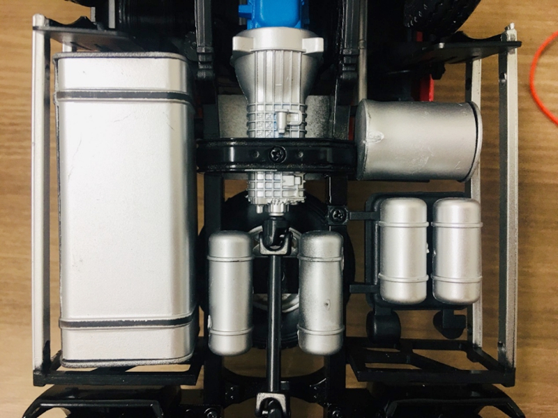 从底下看,可以清晰看到在底盘中部的铝壳变速箱和传动轴,并且在传动轴两旁还有两个储气罐。变速箱外壳使用银色涂装以表明材质,毕竟模型基本不会用合金做这些结构。底盘的布置还是很贴合实际的,只是传动轴偏细,实车的传动轴根据比例可不会那么小。