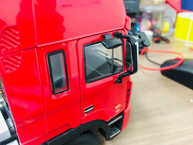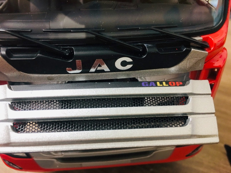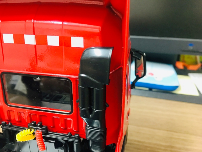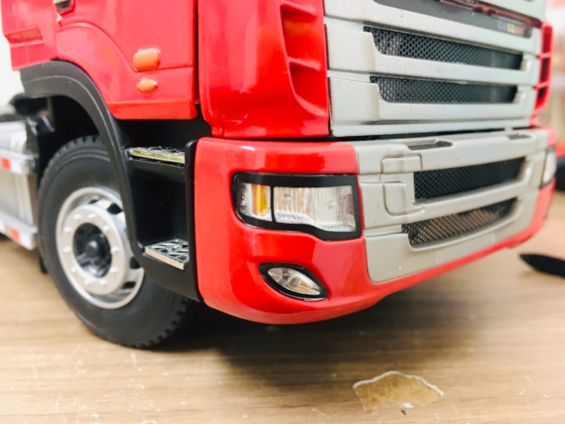下方的前遮阳依旧是斯堪尼亚的风格。参照了斯堪尼亚Topline超高顶驾驶室的设计对车顶部分进行处理之后,连带遮阳罩也照搬。通过将车顶前部突出增加,以将遮阳罩的凸出程度减小,使风阻降低。不过遮阳罩上面的三颗示速灯还是日式风格,因为日本过去的法规强制卡车配备示速灯,国内虽没有相关要求,但部分使用日本卡车制造商驾驶室技术的车型仍然保留着这项设计。而模型上也依然是通过模具成型和上漆表现的方式来展现。遮阳罩两边还有两个细长的示宽灯,也是同样的方式进行处理。