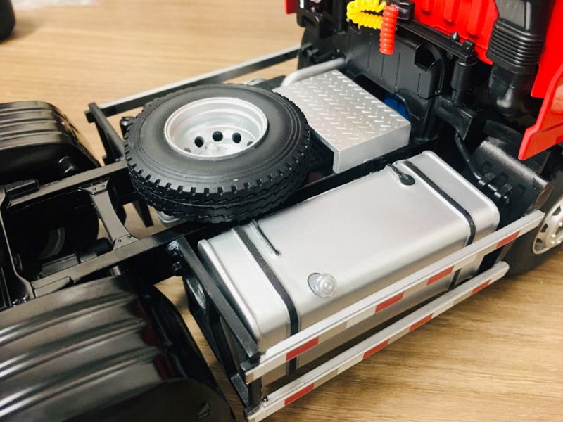 底盘中部,大梁上有一个用螺丝固定的备胎,备胎前方还有挂车连接工作踏板。大梁左侧布置了排气后处理系统,以及电池盒。电池盒底下可见两个储气罐。而大梁右边则是一整个油箱,容积不低,且带有护栏和红白反光带,这个细节很贴近实车。国内大部分卡车模型都是直接装导流板,但实际没有多少用户会选用导流板。