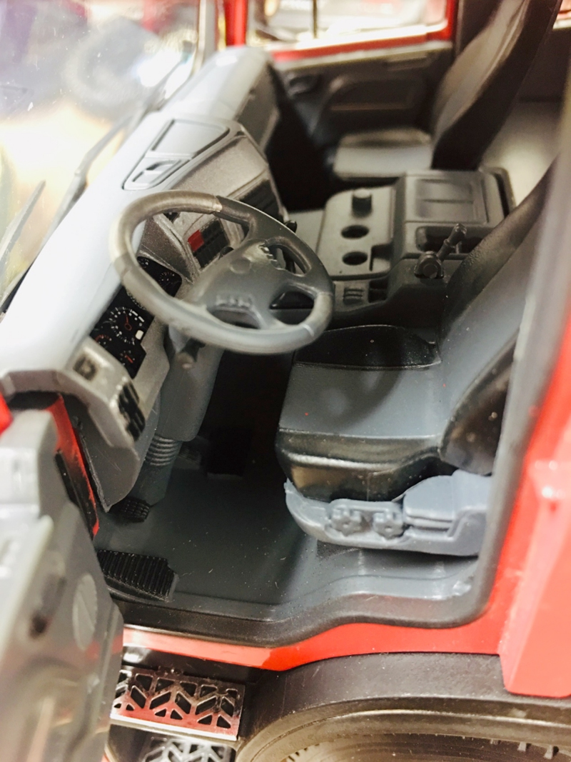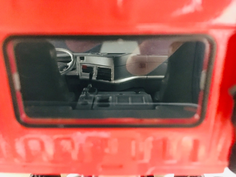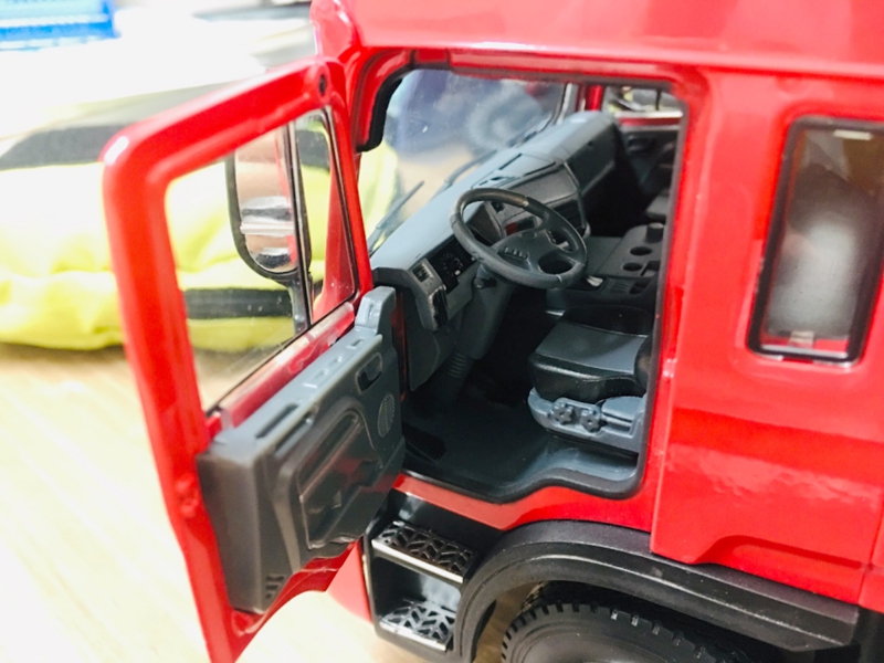 打开主驾驶位的车门,车门和实车一样基本能达到90°开启,但车门的内饰件处理并不能令人满意,离车窗下沿有点距离,且内饰只有开启把手等的两个小处进行了分色,其他地方都是一片塑料灰色。这个情况在驾驶室内部稍好,中控台的一些按钮,仪表盘,换挡杆,以及座椅,都有进行了分色处理,座椅调节旋钮的细节也还原了出来。而在发动机鼓包上,换挡杆,断气刹手柄,还有杯座等的一些结构也悉数还原,看起来没有毛糙的感觉,虽然还是一样的塑料灰色,虽然还是有点粗糙,但相比外观的一些结构而言已经好不少。
