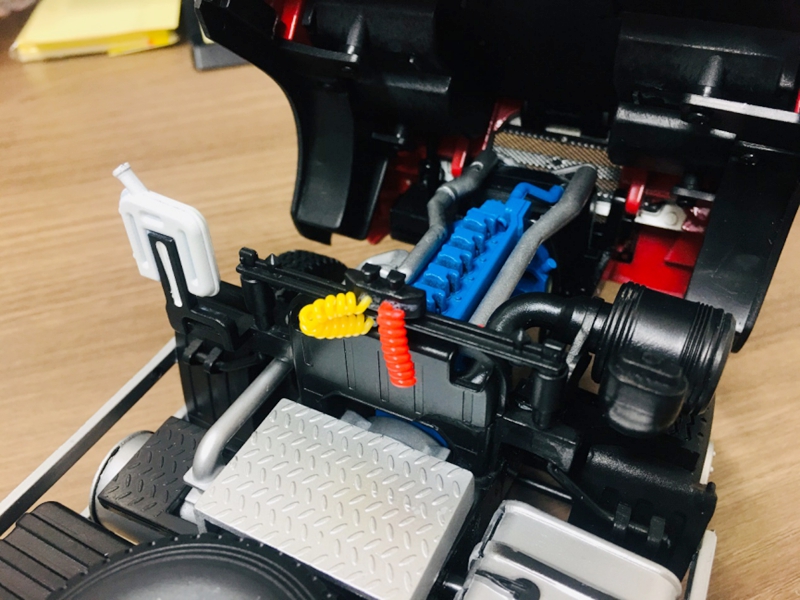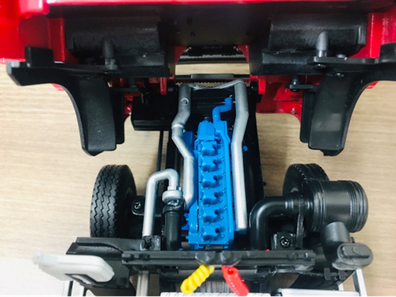 掀起前格栅面罩,我们可以看到安装在驾驶室底下的发动机和散热风扇格栅,以及面罩底下的驾驶室外部结构。不过没有过多的细节,仅仅是在开模具时加入了一点结构的刻画。左边有一个白色小水罐,应该是挡风玻璃清洁液的储存罐。国产模型一般在这个结构上都不会花心思,因此随便的处理是惯例。