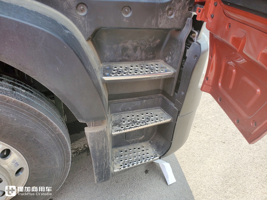 蹬车踏板共有三阶,均为铝合金材质,采用螺钉固定,经久耐用;踏板上有镂空开孔,带有小突起,驾驶员可以在踏板上蹭掉鞋子上的泥土,保持驾驶室的整洁。