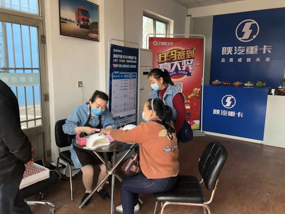 活动当天邀约卡嫂纷纷到店,主动关注我们公众号,了解关注陕汽重卡河北健程更多精彩内容。我们为卡嫂邀约了美甲师到店,为我们卡嫂带来专业美甲体验。同时为了表示我们对卡嫂最崇高的敬意,特送上我们精心准备的礼品。