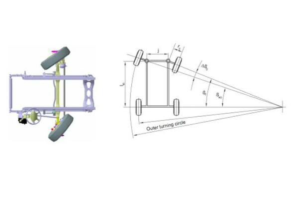大缸径转向器,前轴转向角46°,转弯半径小,狭窄空间转弯方便。