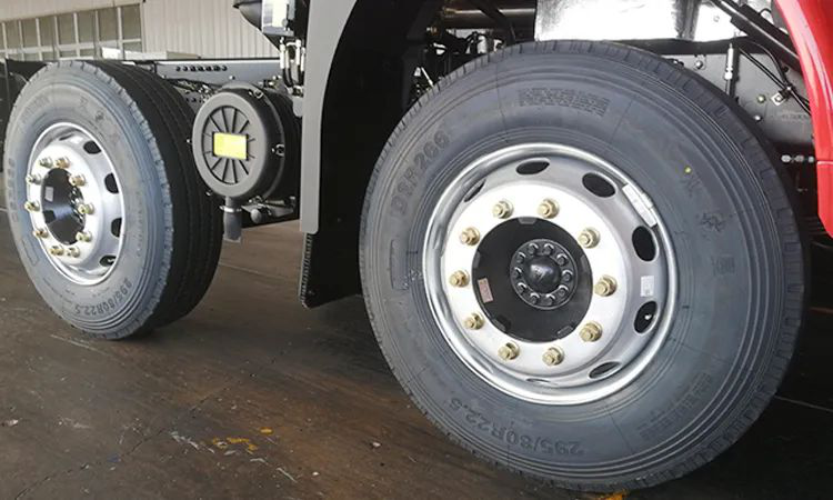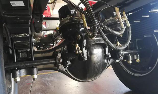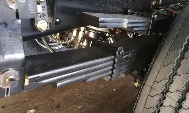 前桥采用汉德MAN4.8吨轻量化盘式前轴,最大制动力矩28000N·m,德国FAG轴承单元,50万公里免维护,免扒轮轂;后桥制动蹄片宽度220mm,制动效果及热衰退性能好,制动安全性高。