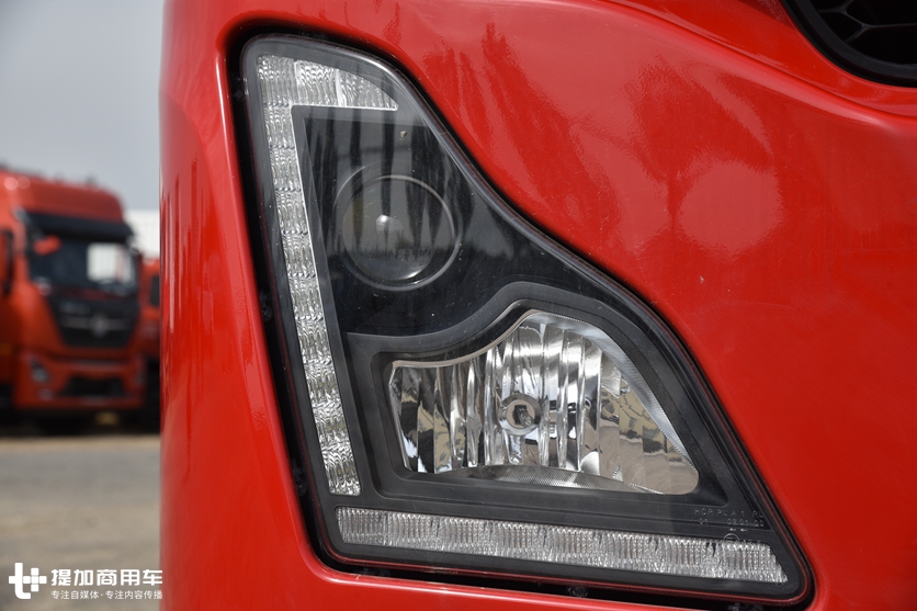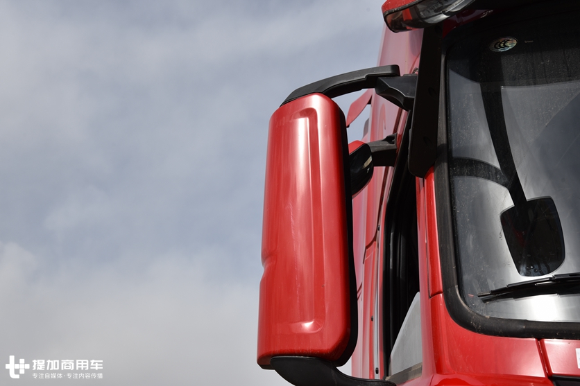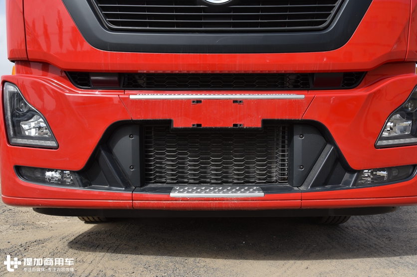 保险杠体积变得更大,这表明驾驶室整体升高了不少,也就具备了采用平地板驾驶室的可能。另外保险杠在增大体积的同时,进风口面积也变大,这对发动机散热系统十分有帮助。保险杠还预留了两级蹬车踏板,踏板用铝合金防滑板覆盖,方便驾驶员蹬车擦拭玻璃。