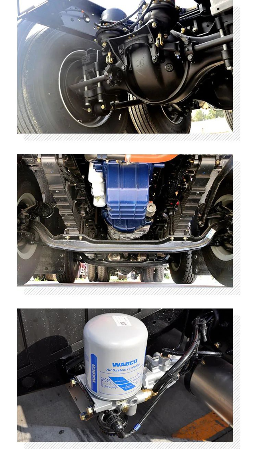通过空气干燥器除水和油水分离器,达到除水和除油2级保障,行业领先制动器和变截面刹车片,性能行业一流。整车线束及气管路全面优化,固定支架、捆扎线束,可靠性更好。