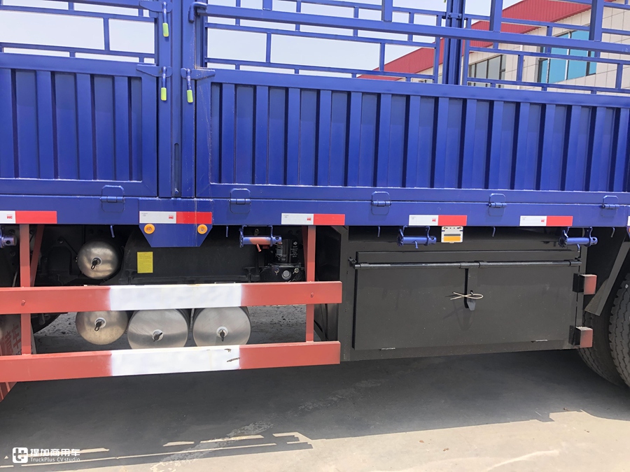 底盘左侧带有堆叠的铝合金储气罐、电瓶,紧凑零部件设计,为储物箱以及冷链车辆配备的发电机组提供了布置便利。