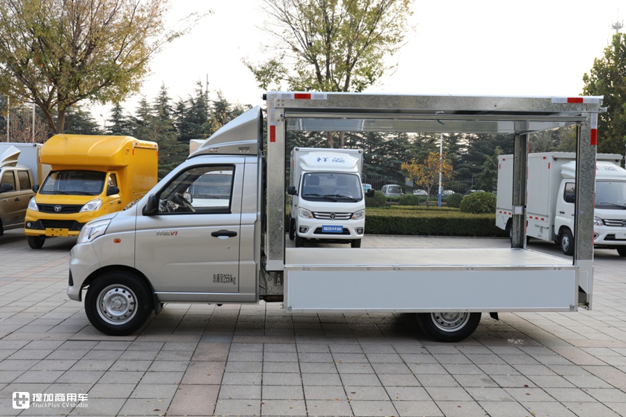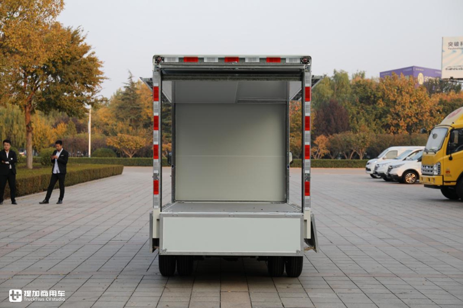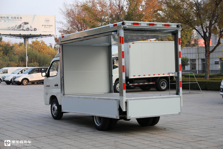 有一款车型侧厢板可以往外拓展,利用液压推杆支撑,变成类似于挡雨板的一块挡板。如果下半部分车厢板可以水平放置,还可以增加摊位的面积,能够多摆一点东西。另外厢体上安装有防水的电源插座,可以连接外部电源。晚上摆摊可以安装照明灯,或者是安装电风扇或者灭蚊设备。