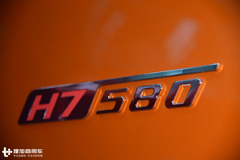 在动力上,H7目前有康明斯、玉柴、潍柴可选,其中搭载康明斯国六版本的H7最大功率可达到600马力,而这台橙色H7则搭载了一台玉柴的YC6K1358-50发动机,排量13升,功率580马力,国五排放。当然,如果你有需求,H7还可以搭载国六版本的玉柴发动机,功率覆盖530、560、600三个马力段,最大扭矩是2600N.m。