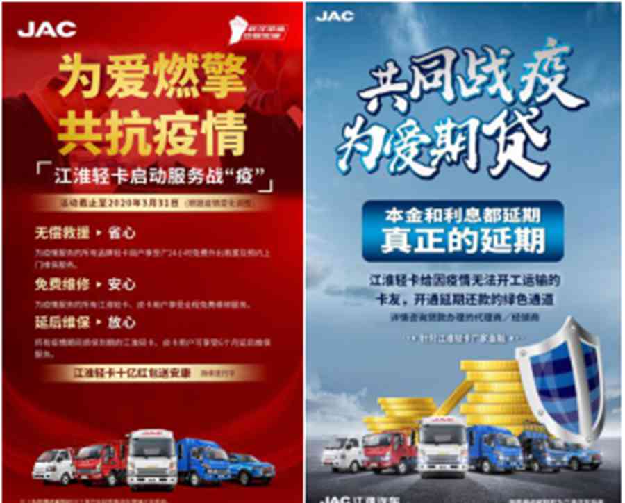 捐钱捐物、免费维修、无偿救援、延期还款、爱心车队,主动关怀,江淮轻卡通过多种形式参与抗疫行动,积极探索疫情下的用户新需求,为疫情之后的市场重启做准备。