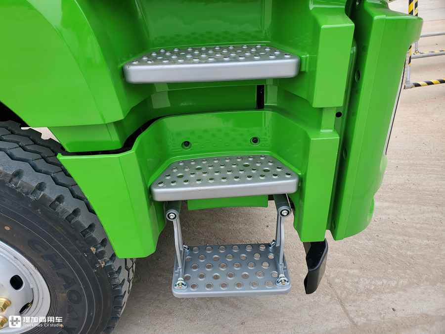 蹬车踏板为三阶式的,最下面一阶是活动踏板,工地行车时受损几率会减小很多,也方便驾乘人员上车。