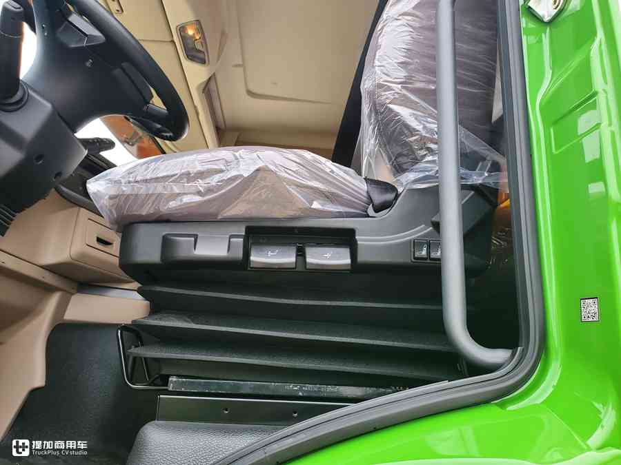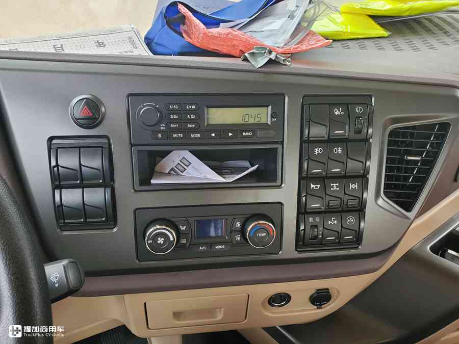 这个JH6自卸车的驾驶室配置应该算低的了,没有大屏,那块区域取而代之的是一个收音机和储物格,下面的空调看似高级,实际也不是自动空调,无法实现自动恒温。旁边的按键区域得益于倾斜式工作台的设计,只要调整好坐姿按键就能实现触手可及。