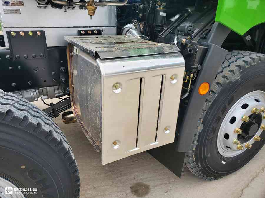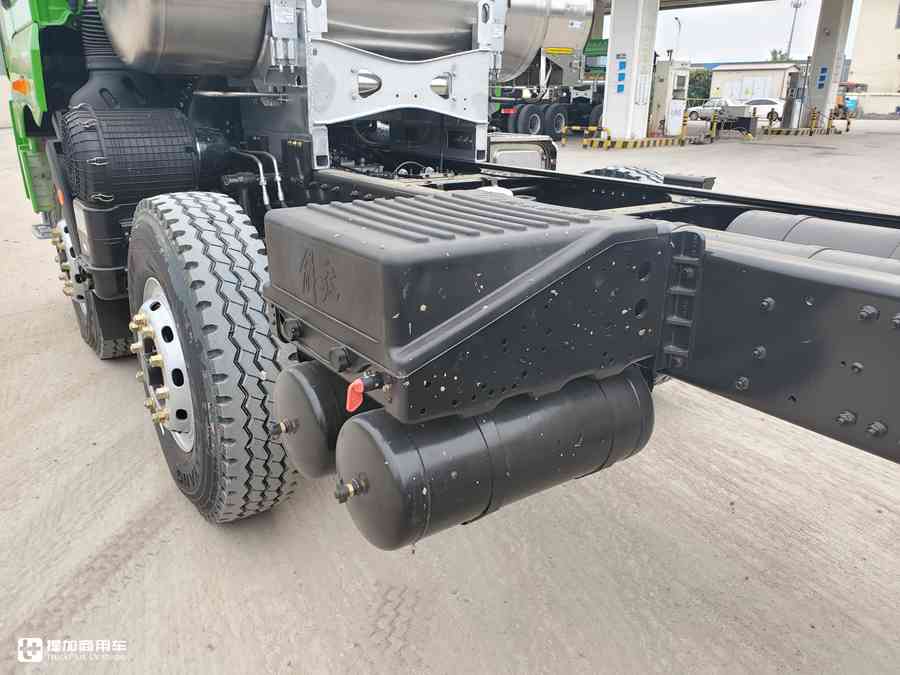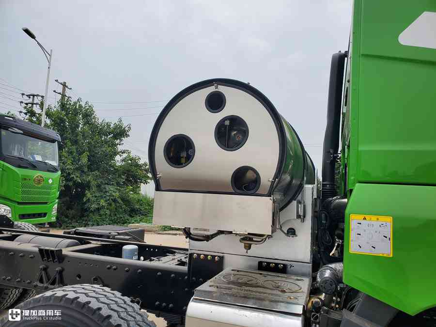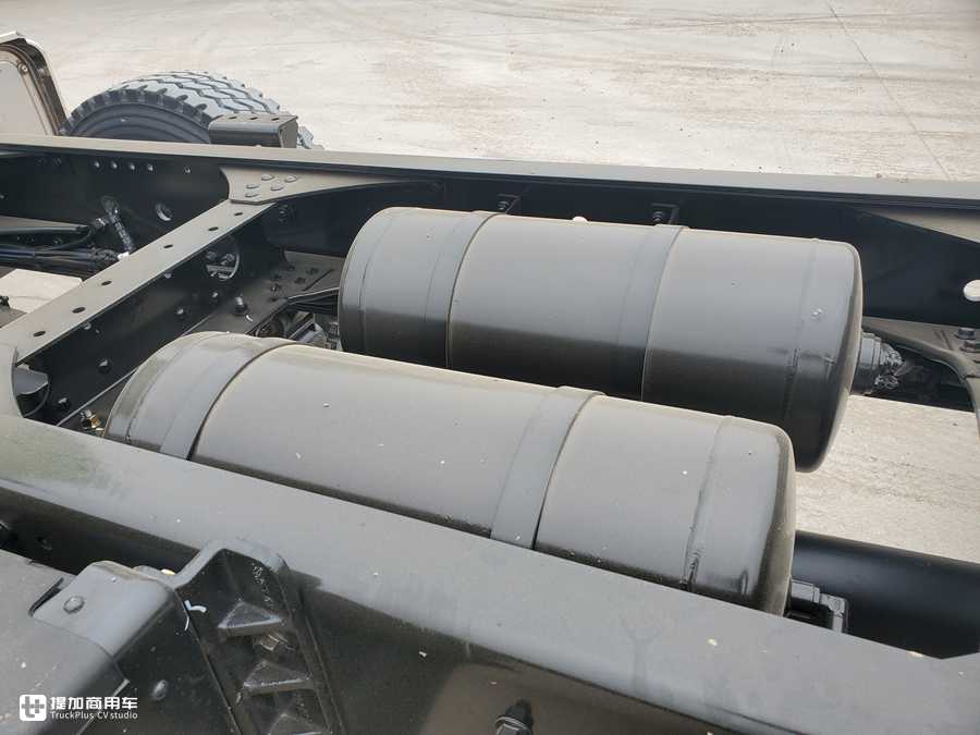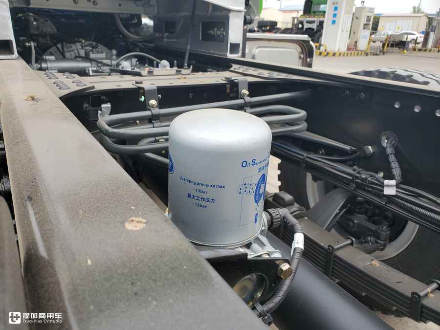 车辆自带解放原厂银罐压缩空气干燥器,因为没有燃油供给系统,所以没有配备柴油滤清器。