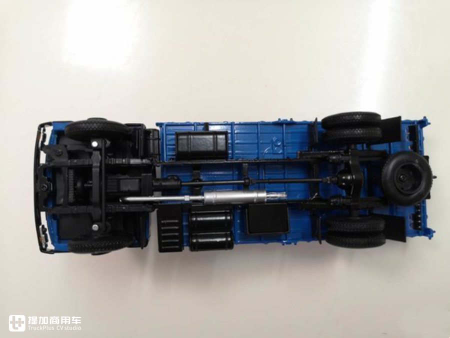 从模型的底盘可见,前轮是支持转向的,像一些钢板吊耳、排气管、传动轴等零部件都刻画出来了,货箱是由螺丝直接锁在大梁上;唯一遗憾的是,后桥总成与传动轴是不联动的,所以转动后轮时传动轴不会跟着转动,只是起到了装饰作用。