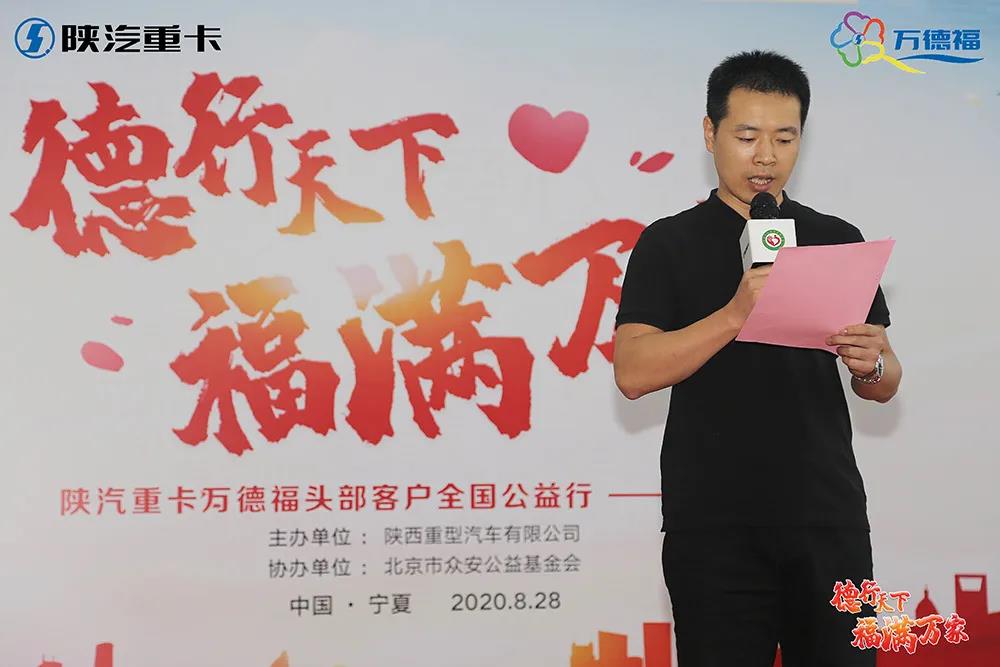 8月30日,陕汽重卡万德福头部客户全国公益行活动第三站来到宁夏同心县,将温暖与关怀带给需要帮助的儿童。陕重汽销售公司副总经理田明、陕重汽销售公司宁夏区域总经理侯卫平、同心县教育工委书记兼教育局局长杨林、同心县团委书记买兰以及山西头部客户等共计六十余人出席活动。本次活动旨在通过陕汽这一平台整合各方资源,最大程度帮助客户实现自我价值。
