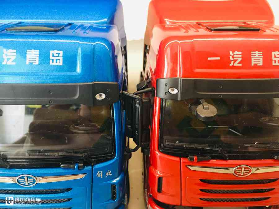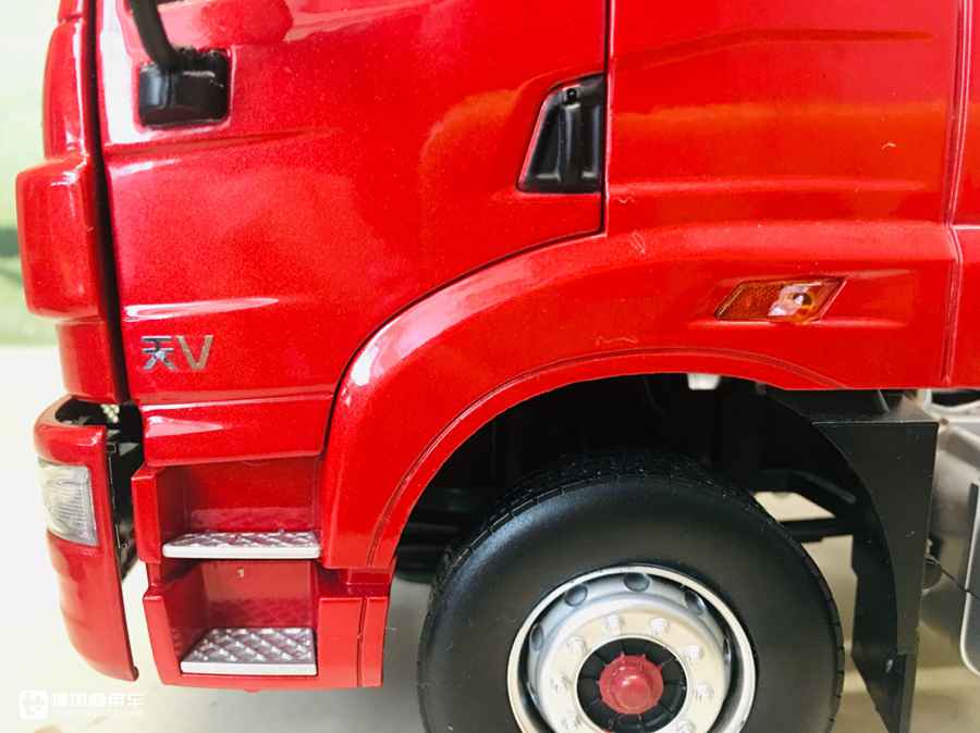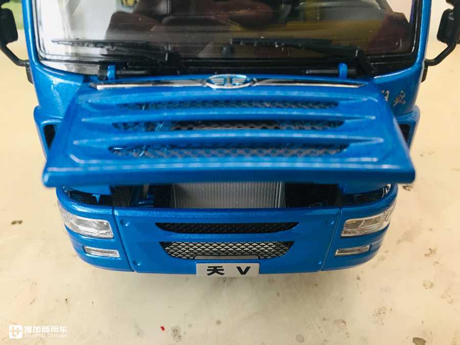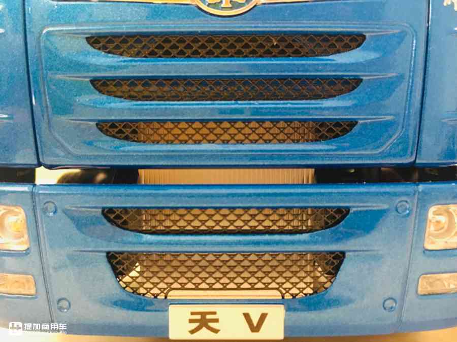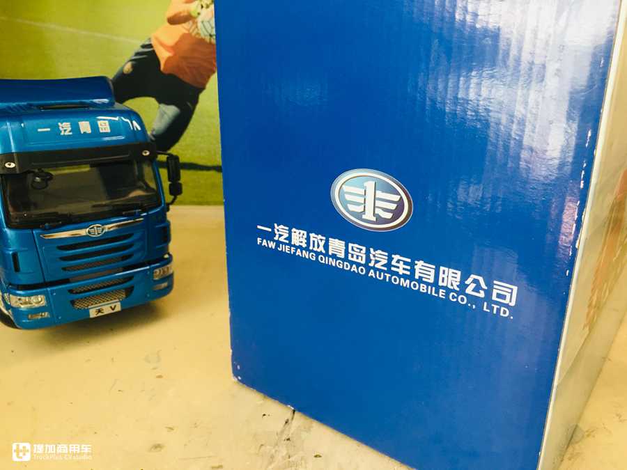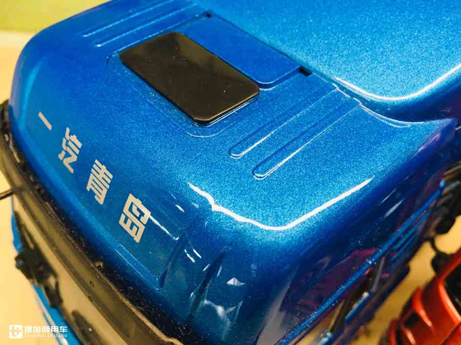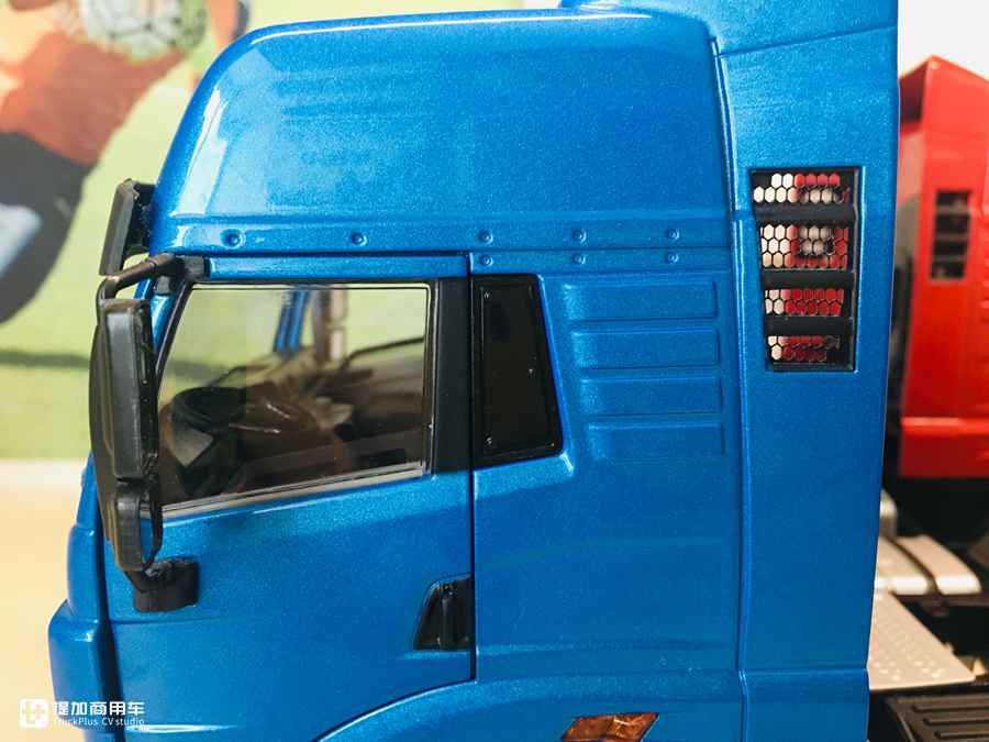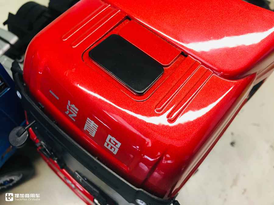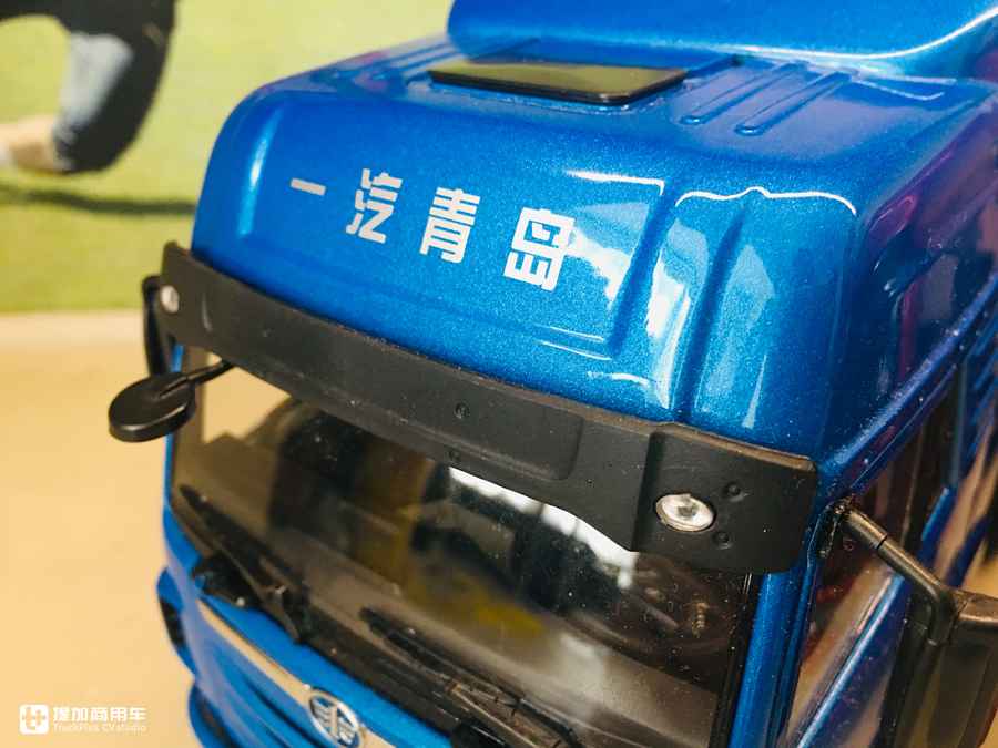 驾驶室前额的位置,天V模型移印上了“一汽青岛”的字体。不过相比与竞品而言,无论是模型还是实车的字体都偏小,宣传的效果较弱。