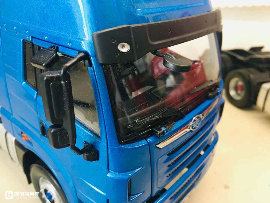 遮阳板的设计也是与驾驶室前额有所呼应,一些设计也是顺应着前额的结构的。在遮阳罩上面已经看不到最初的解放驾驶室上的示速灯设计,毕竟国内并没有如当年日本一样的法规,这个灯的设计就没有存在的意义。但遮阳罩两边还是有装备示廓灯,模型上的示廓灯使用了透明塑料部件,使得其仿真效果更好。不少竞品的模型在示廓灯这个结构上的处理可是马马虎虎,天V模型的这个细节是很好的。