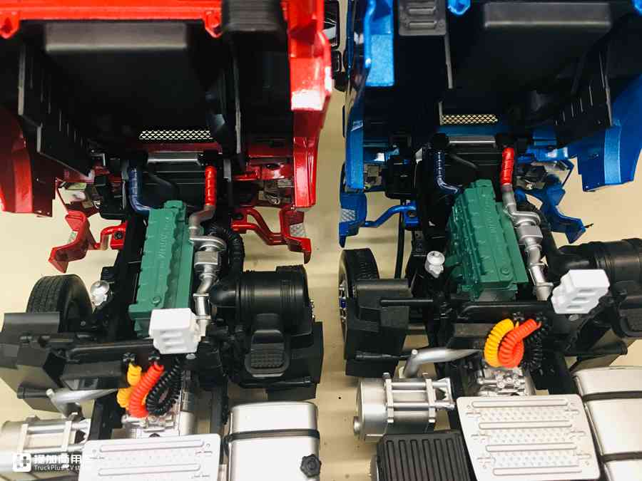 前中网使用合页结构连接到驾驶室本体上,能做到比“大狗腿”更细致,掀起前面罩之后合页不显松动,说明合页的制作还是水平在线的。只是掀起前面罩之后,驾驶室前部结构并没有进行分色,一大片驾驶室本体的蓝色\红色,不显精致,但管线和结构的细节还是通过模具制作了出来,留有空间让追求更细致的模友进行提升。