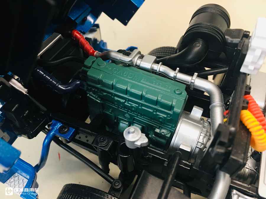 抬起驾驶室,我们来看看发动机。刚才的第一版天V模型侧面已经标注了发动机马力为420,那就是说明模型还原的原车配备了锡柴的11升420马力发动机。模型发动机上的细节标注也非常仔细,发动机型号就是锡柴的主力机型CA6DM。